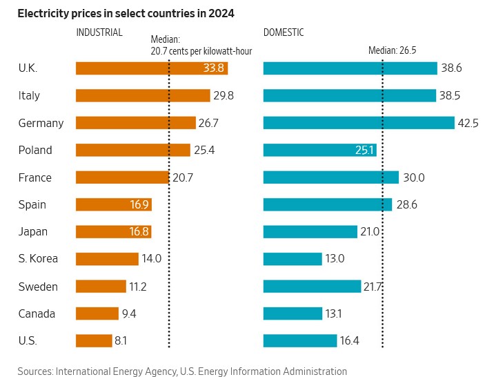 ”Eurooppa on leikannut hiilidioksidipäästöjä enemmän kuin mikään muu alue – 30 % vuoden 2005 tasosta, kun Yhdysvaltojen lasku oli 17 %. Tämä on nostanut fossiilisen ja ydinkapasiteetin tilalle rakennetun tuuli- ja aurinkosähkön riittämättömyyden vuoksi sähkön hintaa rajusti. Saksassa on länsimaiden korkein kotimaisen sähkön hinta, kun taas Isossa-Britanniassa on korkein teollisuuden sähkön hinta (Liitekuva: IEA). Raskaan teollisuuden keskimääräinen sähkön hinta EU:ssa on edelleen noin kaksinkertainen Yhdysvaltoihin verrattuna ja noin 50 % suurempi kuin Kiinan hinta.
